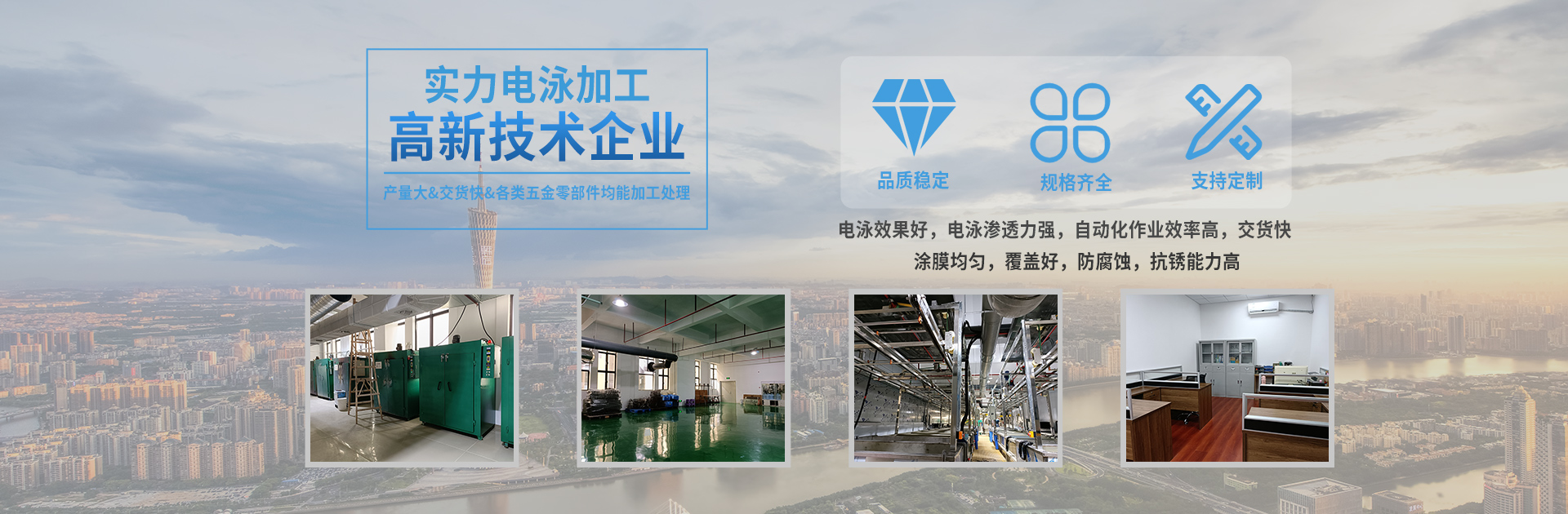 本公司創(chuàng)始于2004年,由專業(yè)的涂料技術(shù)專家及應(yīng)用技術(shù)工程師發(fā)起并組建的高新技術(shù)企業(yè),專業(yè)從事各類金屬電泳涂裝,是專業(yè)的電泳涂料、電泳加工及配套設(shè)備供應(yīng)的高科技公司。 本公司依托多年從事電泳的經(jīng)驗技術(shù),對多種材料(銅、鋁、鐵、不銹鋼、鋅合金、鋁合金等材料)表面處理的研究,采用先進(jìn)的工藝與進(jìn)口原料的配合,完全可以保證客戶產(chǎn)品的表面涂裝,能達(dá)到出口產(chǎn)品的標(biāo)準(zhǔn)要求。主要電泳白色、透明、黑色和紅色、藍(lán)色、黃色、紫色等多種彩色。 憑著先進(jìn)的電泳技術(shù)和嚴(yán)格的品質(zhì)要求,本著以最高的客戶滿意度為目標(biāo),這幾年時間,我們已得到了精密電子五金、衛(wèi)...